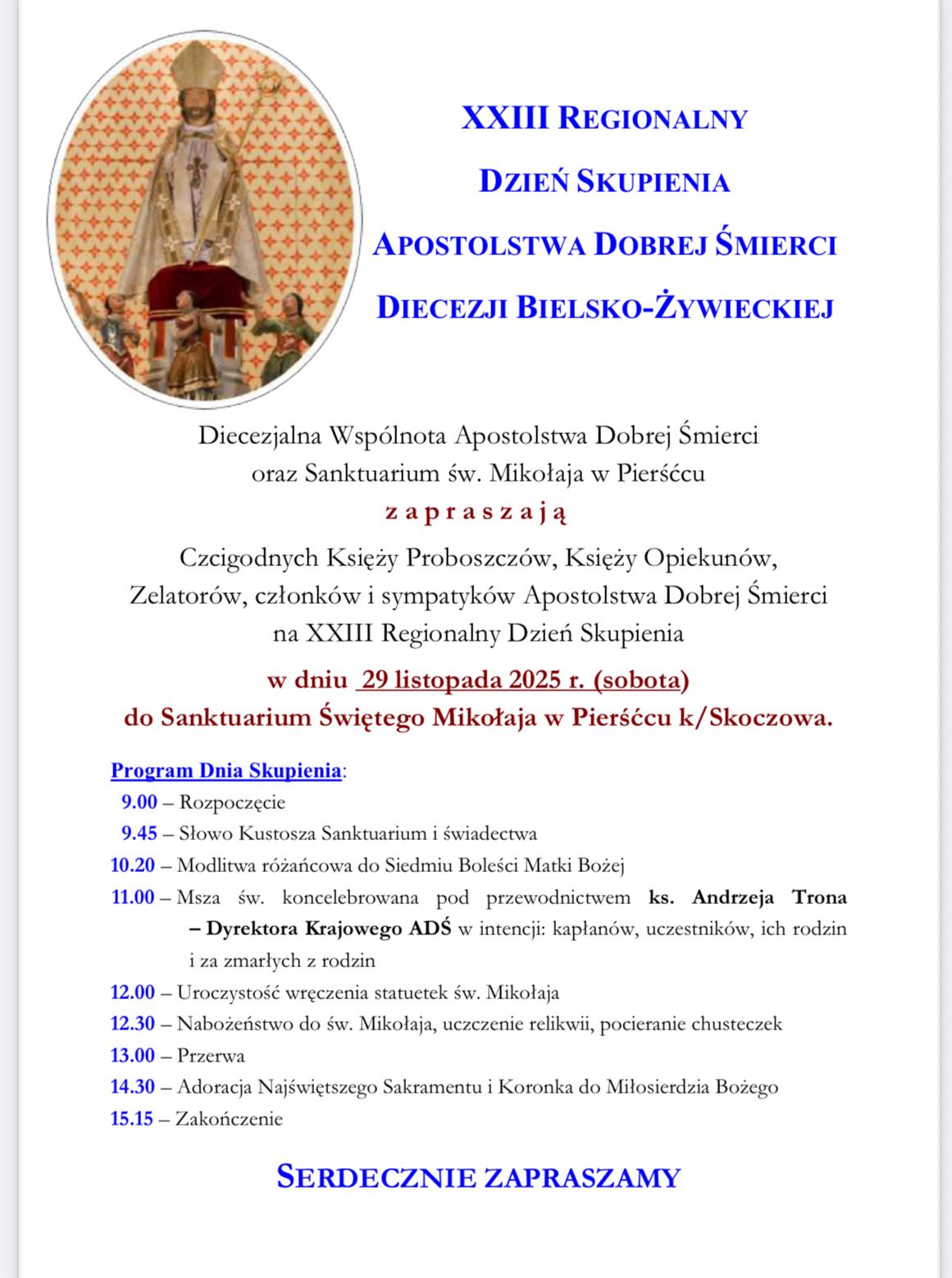 Tego dnia (piątek, 21 listopada) od godz. 15.30, w salce przy plebanii, będzie spotkanie przygotowujących się do Bierzmowania.